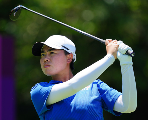 東京五輪ゴルフ女子でティーショットを放つフィリピン代表の笹生優花=5日、埼玉・霞ケ関CC(時事)