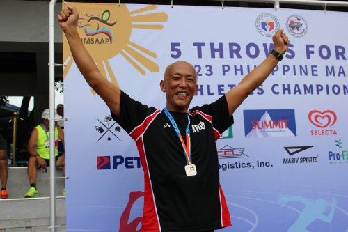 比マスターズ陸上競技選手権の円盤投げなど3種目で銀メダルに輝いた黄田俊英さん=15日、首都圏パシッグ市で沼田康平撮影