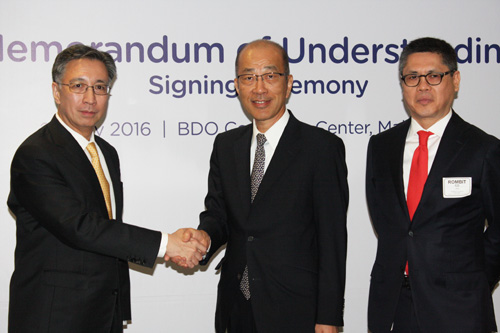 業務提携の覚書に署名後、握手を交わす馬場あおぞら銀行社長(中央)とタンBDO社長(左)=23日午後5時半ごろ、首都圏マカティ市のBDO本社で立田成美写す