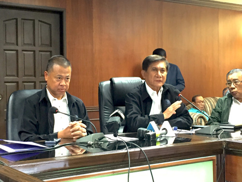 会見で話すシマツ長官(右)とレオネス次官=6日正午ごろ、首都圏ケソン市の環境天然資源省で冨田すみれ子撮影
