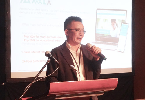 セミナーで発表するVENTENYの行山営業部長=26日午後、マカティ市のホテル・デュシタニマニラで岡田薫撮影