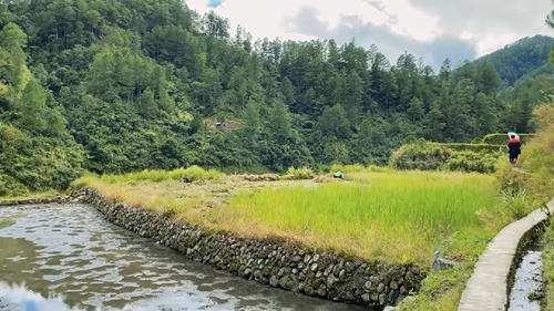 比観光省公式チャンネルに投稿されているASМRプロジェクトのユーチューブ動画の1シーン。バーリッグ町の棚田を歩く足音や風、川の流れる音なども再現されている=比観光省公式ユーチューブより