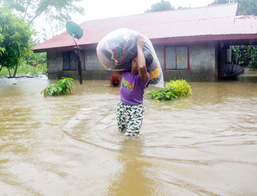 衣類を肩に担ぎながら水浸しになった所を歩く住民=7日、カガヤン州パンプローナ町(EPA=時事)