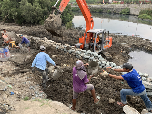 13日、台風の襲来に備え、首都圏で河川の護岸工事を進める人々(EPA=時事)