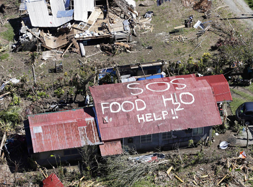 8千に近い死者が出た2013年11月の台風30号(比名ヨランダ)で、レイテ州内の住宅の屋根に描かれた救援を求める文字(EPA=時事)