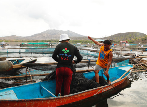 タール火山が再び大規模噴火する可能性が報じられ、タール湖で養殖されている魚の水揚げを急ぐ漁師たち=5日にバタンガス州ラウレル町で撮影(EPA=時事)