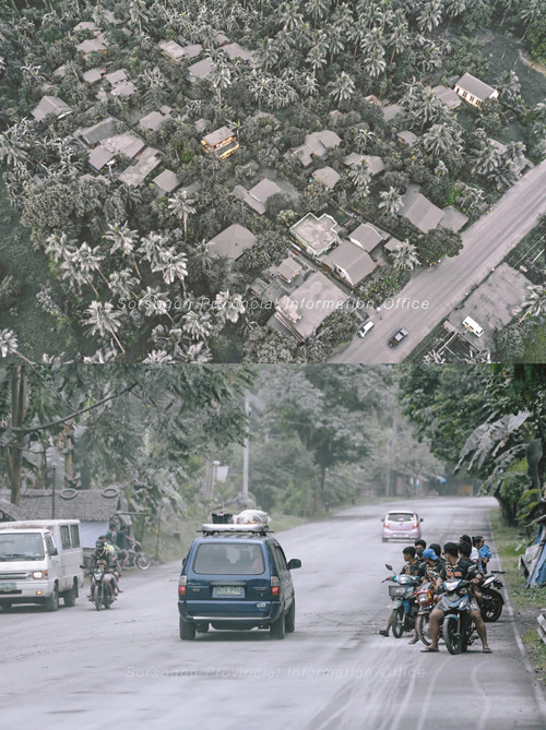 (上)ブルサン火山の水蒸気爆発による降灰=5日(ソルソゴン州広報室提供)/(下)ブルサン火山の灰が降った町の様子=5日(ソルソゴン州広報室提供)