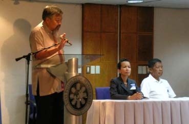 米平和研究所主催のフォーラムに出席したロディル団長代理(右端)。演説するのはメルカド新団長=19日午前11時20分ごろ写す