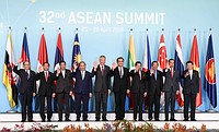 28日、東南アジア諸国連合(ASEAN)首脳会議が開かれたシンガポールで、記念撮影に応じる各国首脳(AFP=時事)