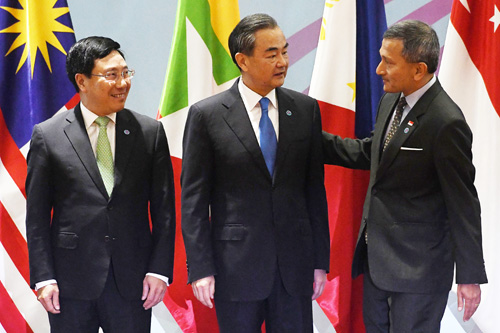 2日、シンガポールで会談する東南アジア諸国連合(ASEAN)議長国である同国のバラクリシュナン外相(右)と中国の王毅外相(中央)。左はベトナムのファム・ビン・ミン副首相兼外相(AFP時事)