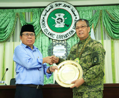 笑顔で握手を交わすガルベス国軍参謀総長(右)とMILFのムラド議長=国軍提供