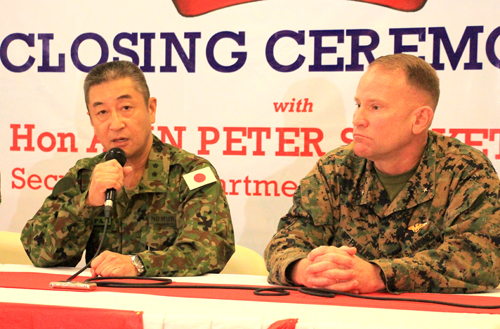記者会見に応じる野村悟陸将補(左)とマックフィリップス米司令官=10日午前10時ごろ、首都圏タギッグ市で森永亨撮影