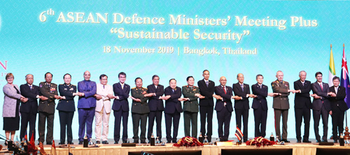 18日、バンコクで開かれた拡大ASEAN国防相会議に先立ち、写真に納まる各国国防相ら(時事)