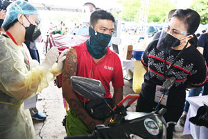 副大統領事務所とマニラ市共催の経済フロントライナーのための予防接種活動で、配達員にシノバック製新型コロナワクチンを接種するボランティア医療従事者(左)を見守るロブレド副大統領(右)=7月20日、マニラ市(AFP=時事)