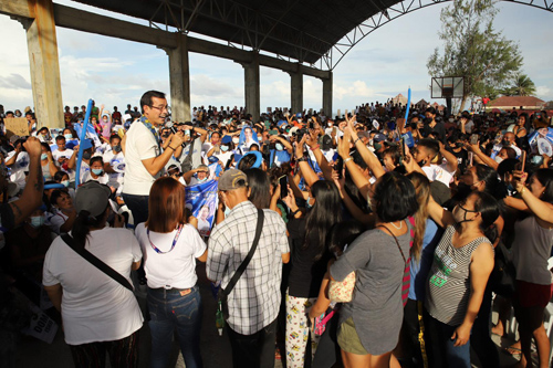 アクラン州ニューワシントン町の集会で詰めかけた支持者に笑顔を向けるモレノ候補=モレノ陣営メディア提供