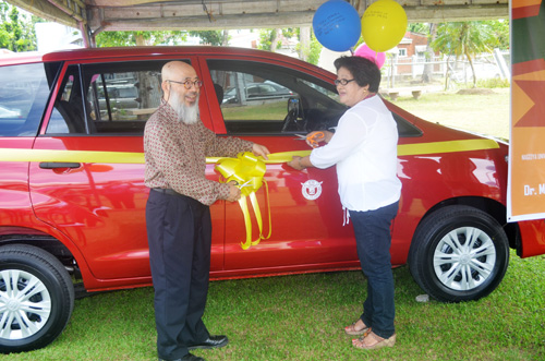 校用車は、トヨタ自動車製の赤い8人乗り多目的ワゴン。名古屋外語大、名古屋学芸大、名古屋学芸短期大の3校の学生、職員が募金活動で集めた寄付金約240万円で購入された。