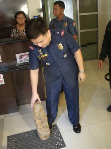 報道陣に公開された不発弾=23日午後2時15分ごろ、首都圏ケソン市の国家警察本部で写す