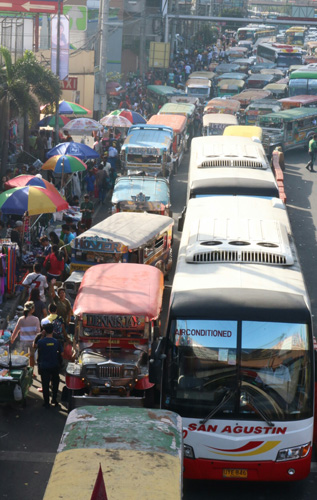 クリスマスの帰省ラッシュで混み合うエドサ通り=24日午後4時ごろ、首都圏パサイ市で写す