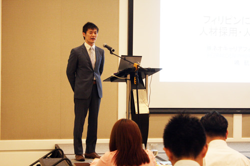 比人採用時の留意点を説明する嶋航代表=18日午後3時10分ごろ、首都圏マカティ市内のホテルで立田成美写す