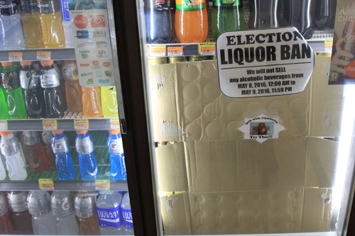 販売中止の告知が張られた酒類売り場=8日午後3時ごろ、首都圏マカティ市で鈴木貫太郎写す