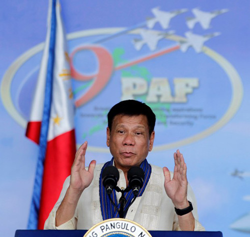 ルソン地方パンパンガ州のクラーク空軍基地で演説するドゥテルテ大統領=大統領府提供