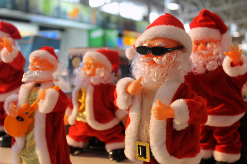 早くも店頭に並んだサンタの置物=首都圏マカティ市の商業施設で冨田すみれ子写す