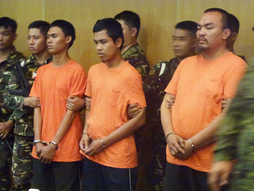 逮捕された容疑者3人=7日午後3時ごろ、首都圏ケソン市の国軍本部でロビーナ・アシド撮影