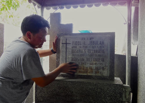 墓石の清掃作業に汗を流す男性=28日正午、首都圏マカティ市の南部墓地で高橋鈴撮影