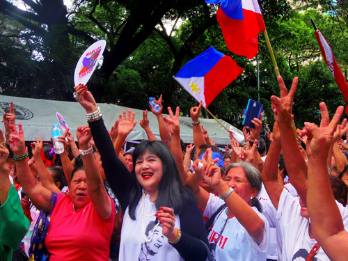 判決に喜びのVサインを示すマルコス英雄墓地埋葬賛成派の人々=8日午後1時ごろ、首都圏マニラ市の最高裁前で高橋鈴撮影