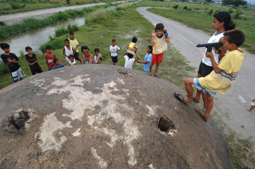 ジェネラルサントス市に残る旧日本軍の塹壕跡で遊ぶ子どもたち(AFP=時事)
