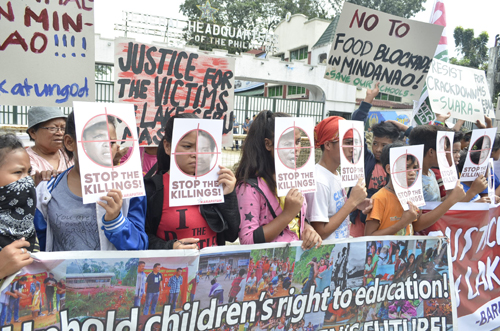 左派系人権団体カラパタンは6日午前、戒厳令延長に反対して首都圏ケソン市の国軍本部前で抗議集会を開いた。集会には人権団体メンバーや、ミンダナオ地方の学...