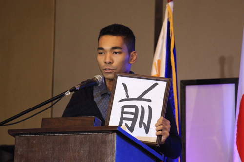 自身で書いた大好きな漢字「前」を見せるファイズ・ムカイニさん=11日午後4時半ごろ、首都圏ケソン市で森永亨撮影