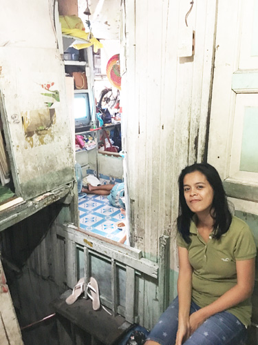 三つある1室の前で休むベベリー・オカンポさん。部屋には義理の母と兄弟、娘がくつろいでいた=6日午後2時ごろ、首都圏マカティ市で森永亨撮影