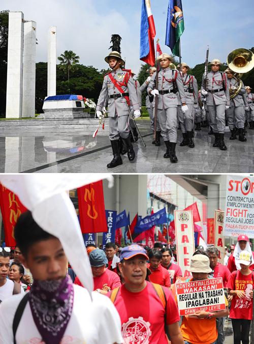 (上)26日のフィリピンの「英雄の日」にちなみ、無名戦士が眠る首都圏の英雄墓地を行進する国軍兵士ら(AFP時事)。(下)千人を超える労働者らが正規雇用化や賃金引き上げを求めてデモを行った=26日正午ごろ、首都圏マニラ市メンジョーラで岡田薫撮影
