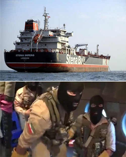 (上)イランに拿捕された英船籍タンカー「ステナ・インペロ」=7月22日、イラン・バンダルアバス沖(AFP=時事)。(下)ステナ・インペロの拿捕に着手する黒い覆面姿のイラン精鋭部隊「革命防衛隊」隊員=7月20日、革命防衛隊提供(AFP=時事)