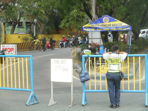 マカティ─マンダルーヨン橋のマンダルーヨン市側たもとでは、マカティ市からの車線は検問で渋滞が発生、マカティ市への車線は封鎖されていた=17日午後3時ごろ撮影