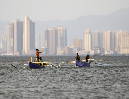 マニラ湾で小舟に乗って魚を捕る漁師(EPA=時事)