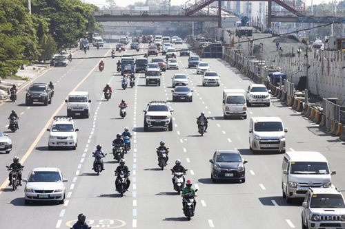 15日までは昼間でもほとんど車の姿がなかったケソン市のコモンウェルス通りでは、車の通行が絶えなかった(EPA=時事)