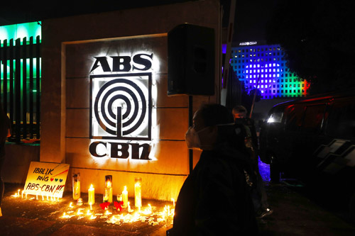 ABS─CBNのロゴマークの前に放送復活を願う人々が灯したろうそく=10日撮影(EPA=時事)