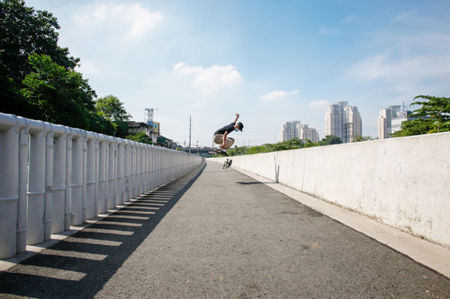 首都圏の防疫措置が始まってもうすぐ半年になる中、パシッグ市でスケートボードをする青年。GCQ下では、体が触れ合うスポーツはまだ禁止されており、認めら...