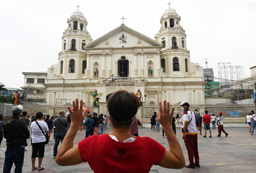 マニラ市のキアポ教会の外で間隔を開けて祈る人々(AFP=時事)