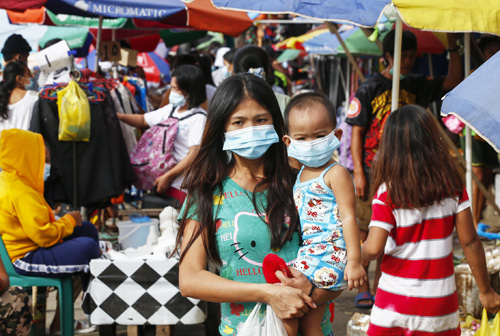 幼児を抱いて買い物に来た女性=1日、ケソン市(EPA=時事)
