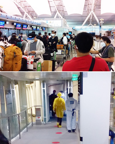 (上)関西空港でフィリピン航空のカウンターに並ぶ乗客。比人が9割を占めていた。マニラ便の出発時間の関係か他のカウンターにはほとんど人はいなかった=7日、竹下友章撮影。(下)到着したマニラ空港でも厳重な防護服姿の空港関係者の出迎えを受けた=同
