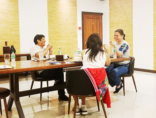 ダバオ市内のレストランでサラ氏(右)の誕生日を祝う食事会で談笑するアイミー・マルコス氏(中央)とボンボン・マルコス氏=ダバオ市広報写真
