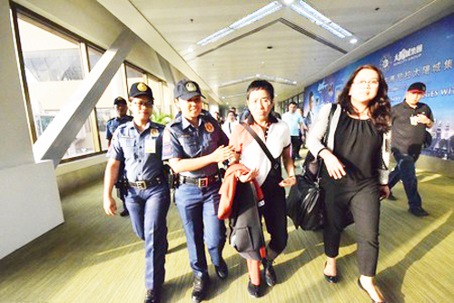 空港に到着直後、フィリピン警察に連行されるフィリピンのジャーナリスト、マリア・レッサ氏(中央)=2019年3月、マニラ(AFP時事)