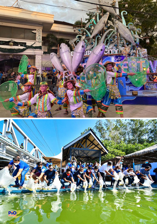 (上)バグス祭りのパフォーマンス。(下)バグス祭りでダウェル川にバグスの幼魚を放流する市民=ダグパン市広報室のフェイスブックより
