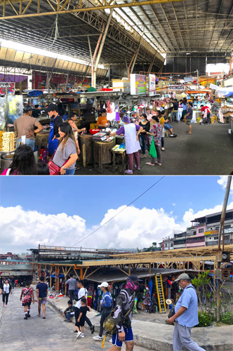 (上)新しい屋根の建設が完了し、賑わいを取り戻したバギオ公設市場。(下)むき出しの鉄骨に火事の跡も見受けられたが、更地から復活し路上販売も終了していた=5月14日、バギオ市で深田莉映撮影