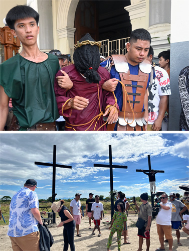 (上)キリストの受難劇=3月29日、パンパンガ州サンフェルナンド市メトロポリタン大聖堂で深田莉映撮影。(下)ゴルゴダの丘を模した広場=3月29日、パンパンガ州サンフェルナンド市で深田莉映撮影