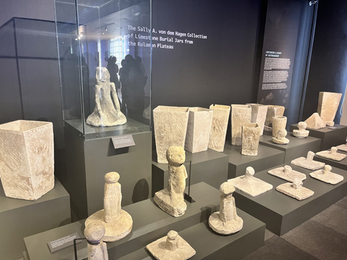 寄贈された1450年前の石灰製埋葬壺などの展示品=7日、国立人類学博物館で深田莉映撮影