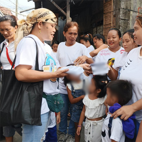 マニラ市トンド地区で結核感染に関するパンフレットなどを配るコミュニティーリーダーのカベリョさんら